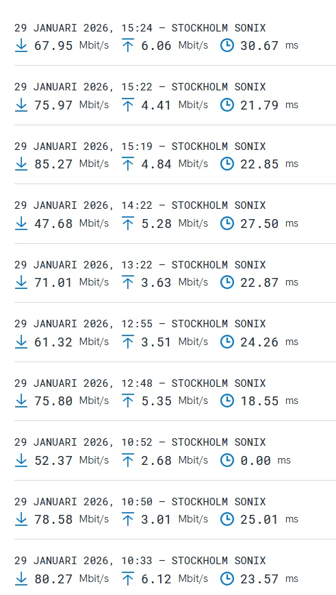 Tidigare med max 150 28/1 = 106 mbit/sek nu med max 1000 = 178 mbit/sek plats Höjdhagen Gustavsberg.