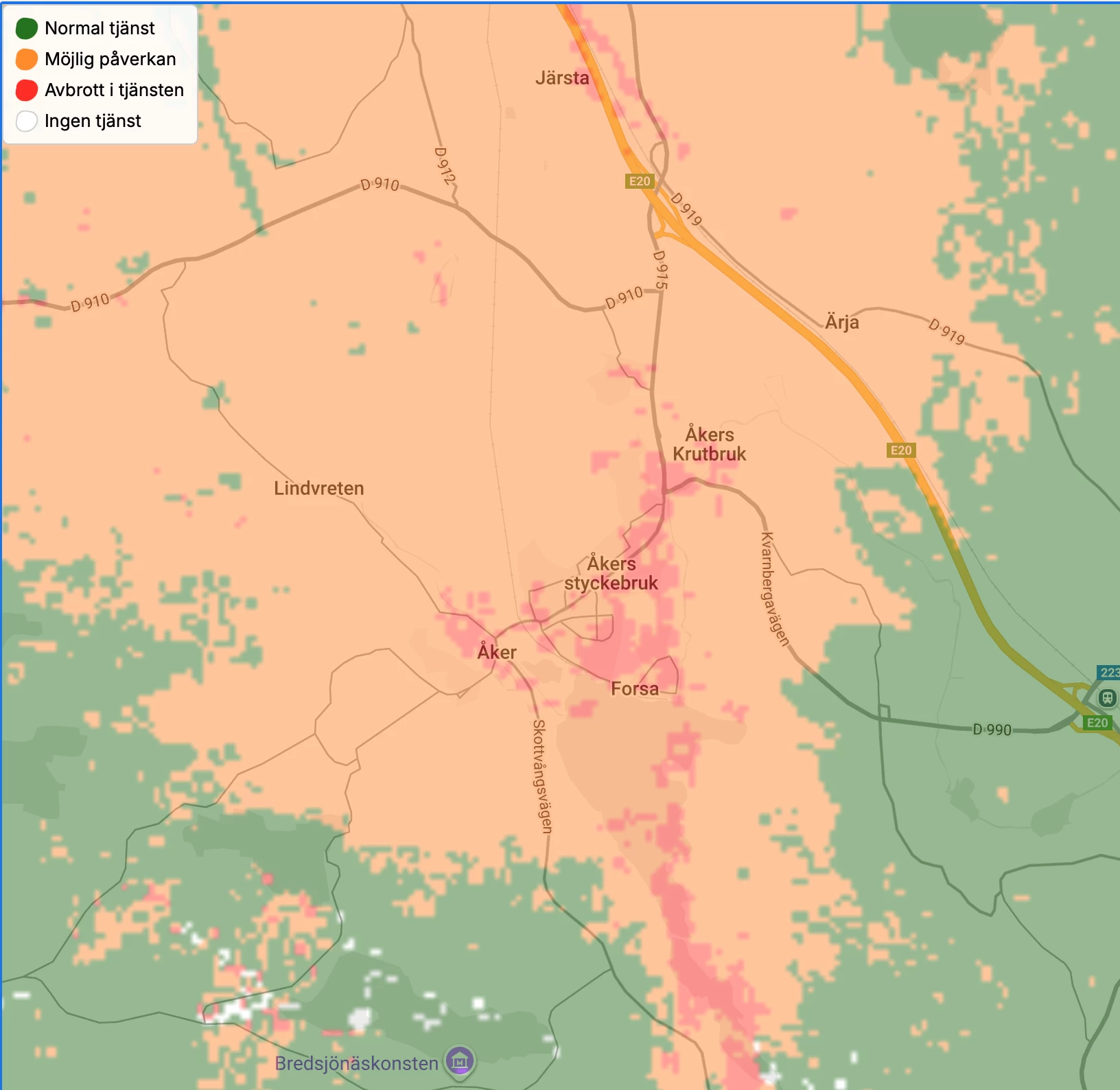 det finns just nu en pågående driftstörning i Åkers styckebruk med omnejd, se område nedan, som påverkar 4G och 5G-nätet. Tre är medvetna om felet. Just nu är det beräknat att det är åtgärdat under morgondagen. Skulle så inte vara fallet kan du kontakta kundservice som kan hjälpa dig vidare. Om du fortsatt kan genomföra samtal, är det rekommenderat att du ringer till kundservice under öppettiderna - du hittar kontaktuppgifter här.