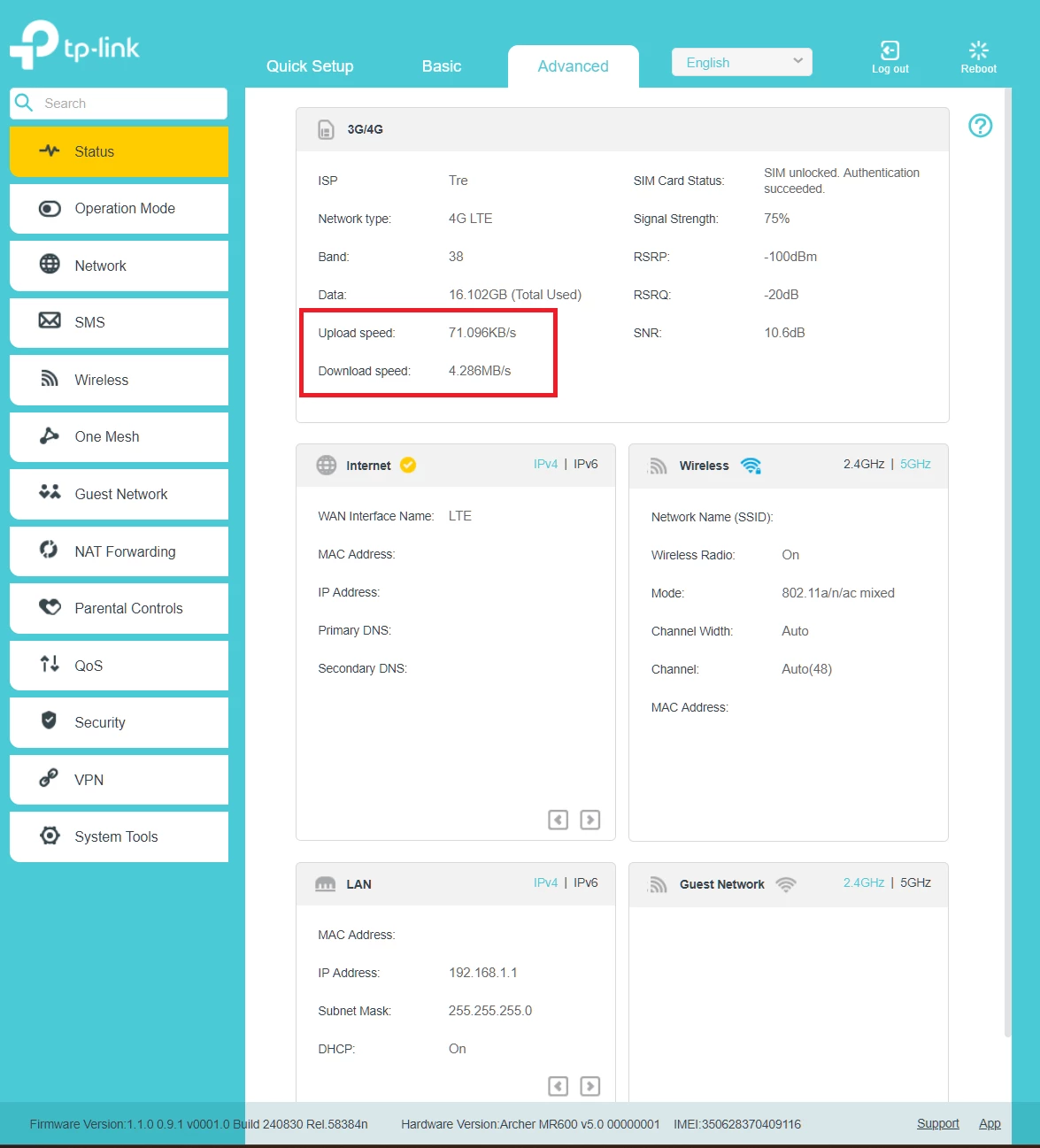 Köpte en TPLink Archer MR600 som jag satt upp vid fönstret och kopplat in i min stationära dator med Cat6 ethernet, dock får jag riktigt dålig hastighet.